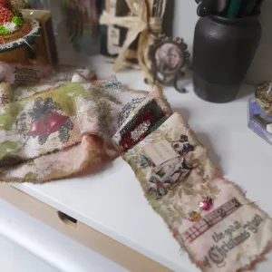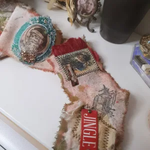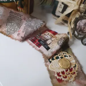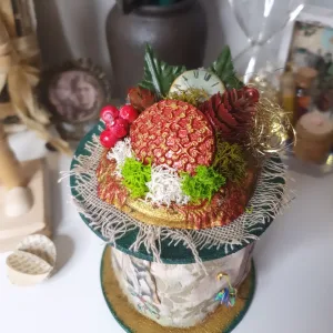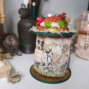 Esta bobina es muy diferente, es más grande y decidí también aplicar técnicas de Mix media y decorarla con moldes de cerámica hechos por mí y que luego pinté, musgo, brillo… y siempre usando los colores típicos, Rojo, verde, dorado…..