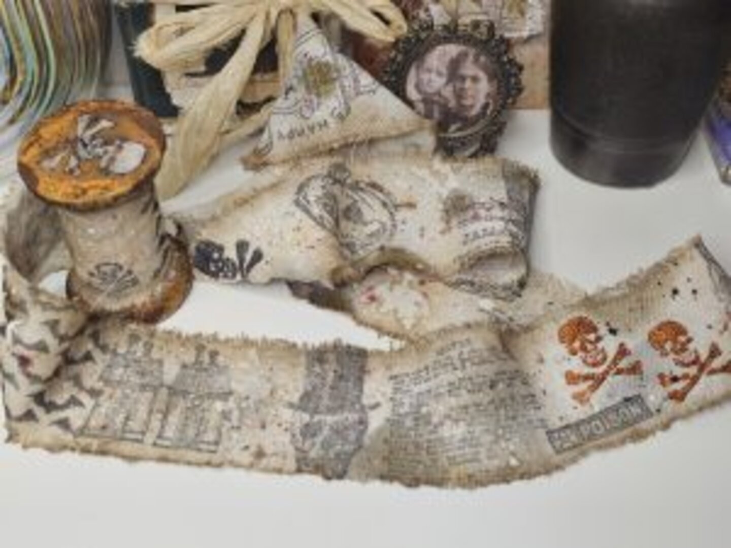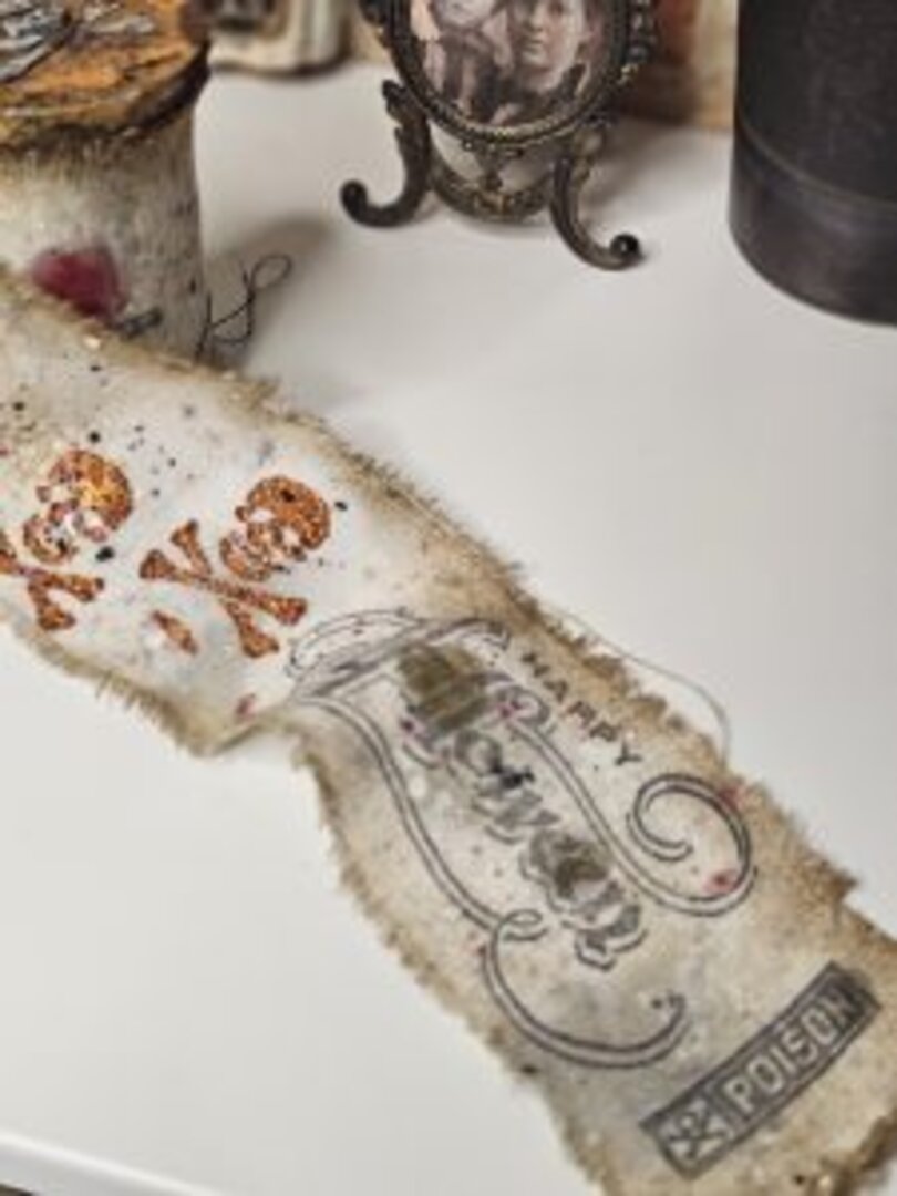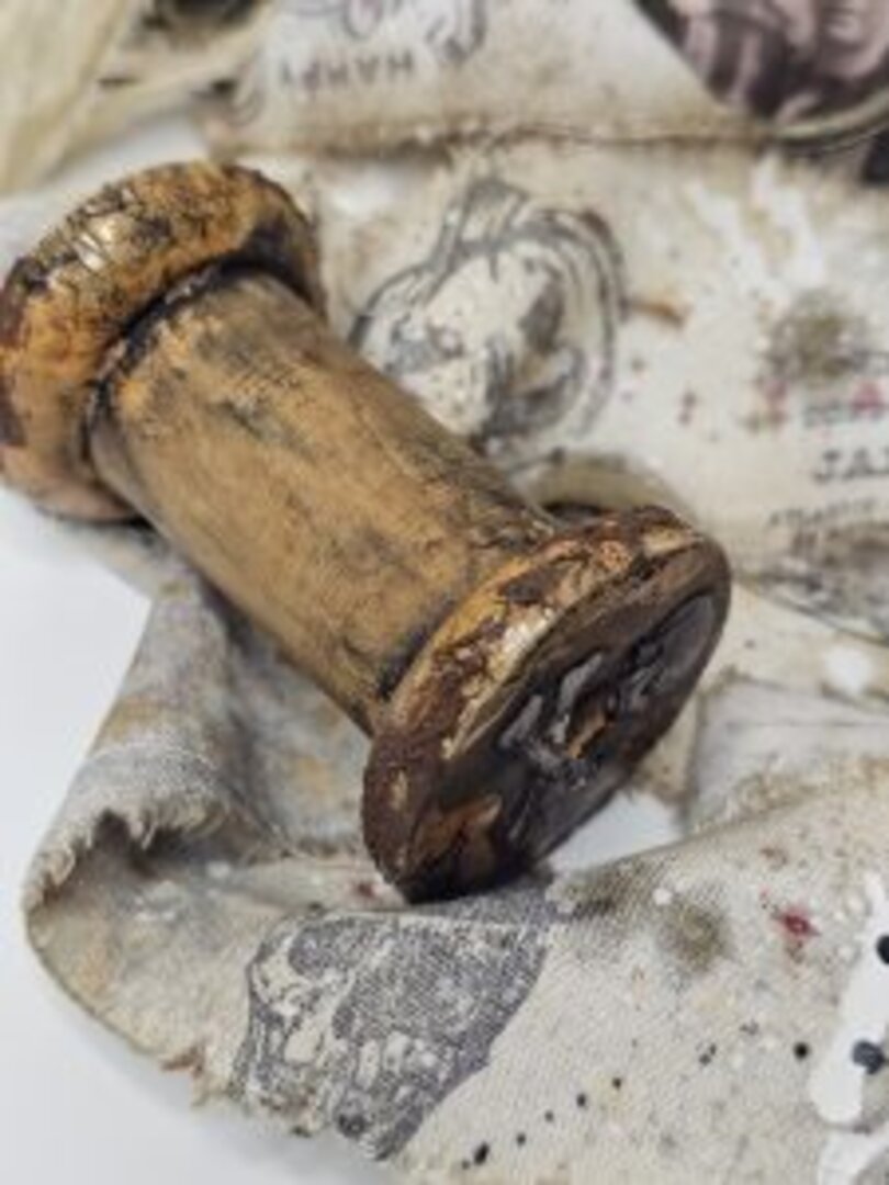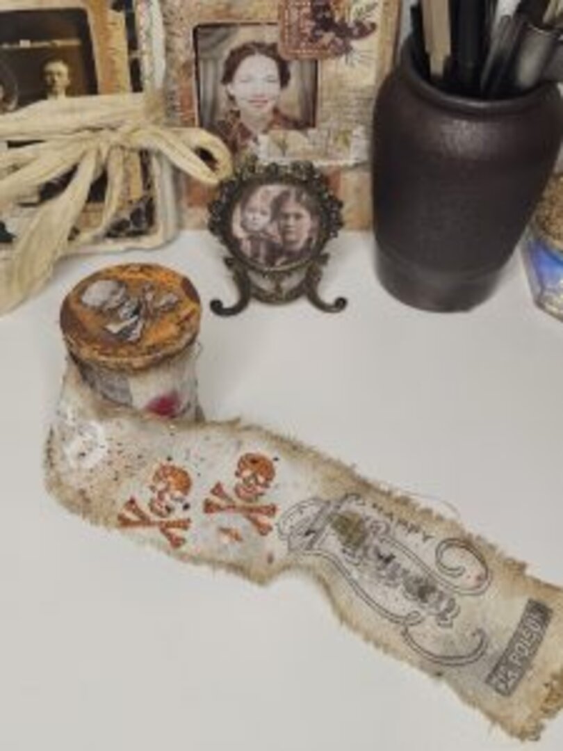 En este caso, colores muy acordes a la temática, predominan los calabaza, negros, rojos y en la bobina no, pero en el junk también los morados. En este caso la bobina también es antigua y de madera, pero quise pintarla envejecerla, darle esos toques de óxido tan bonitos que deja el paso del tiempo. Para ello usé técnicas de Mix Media.