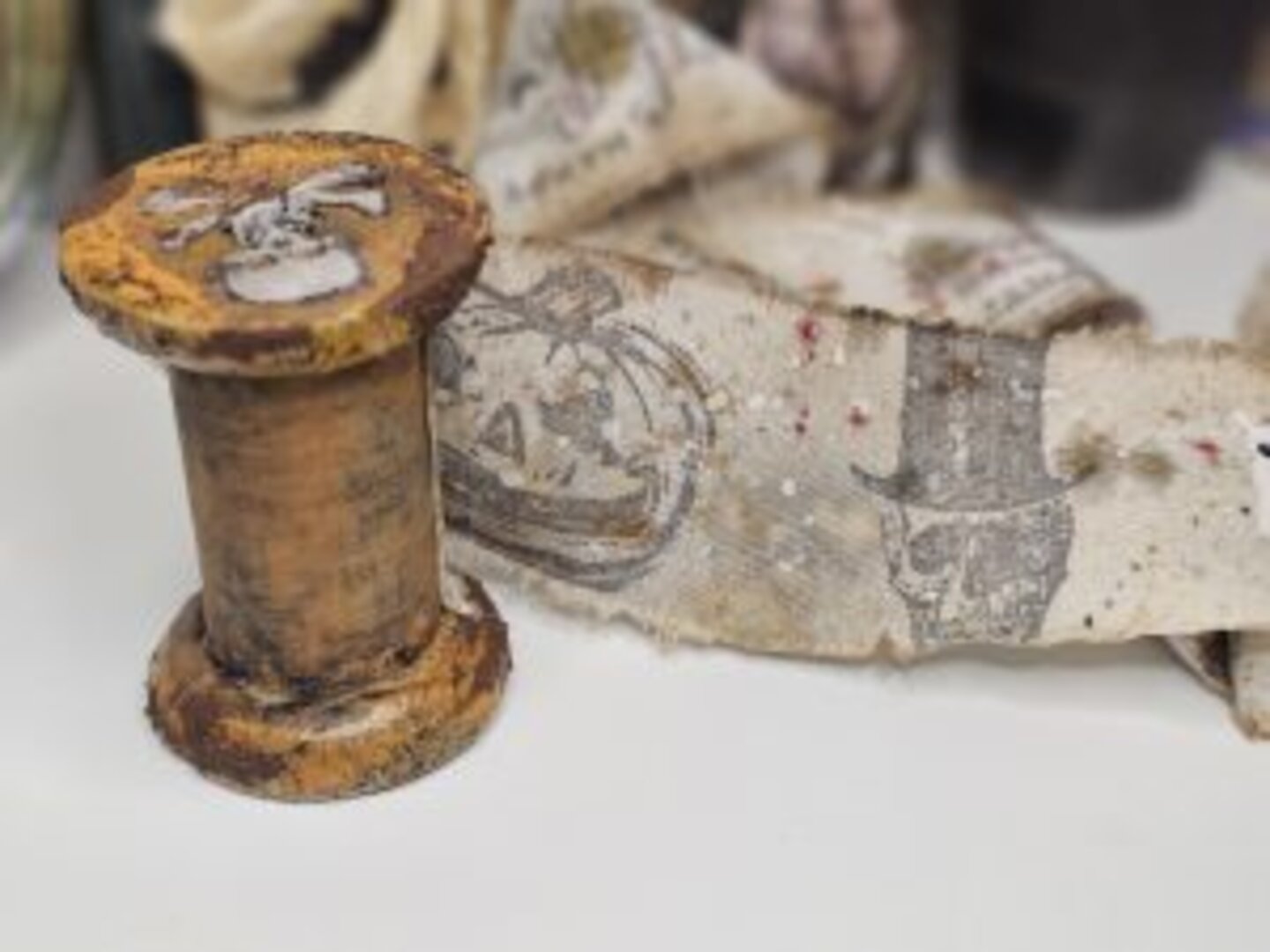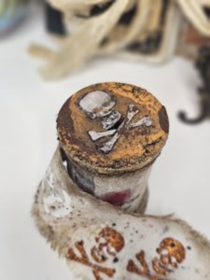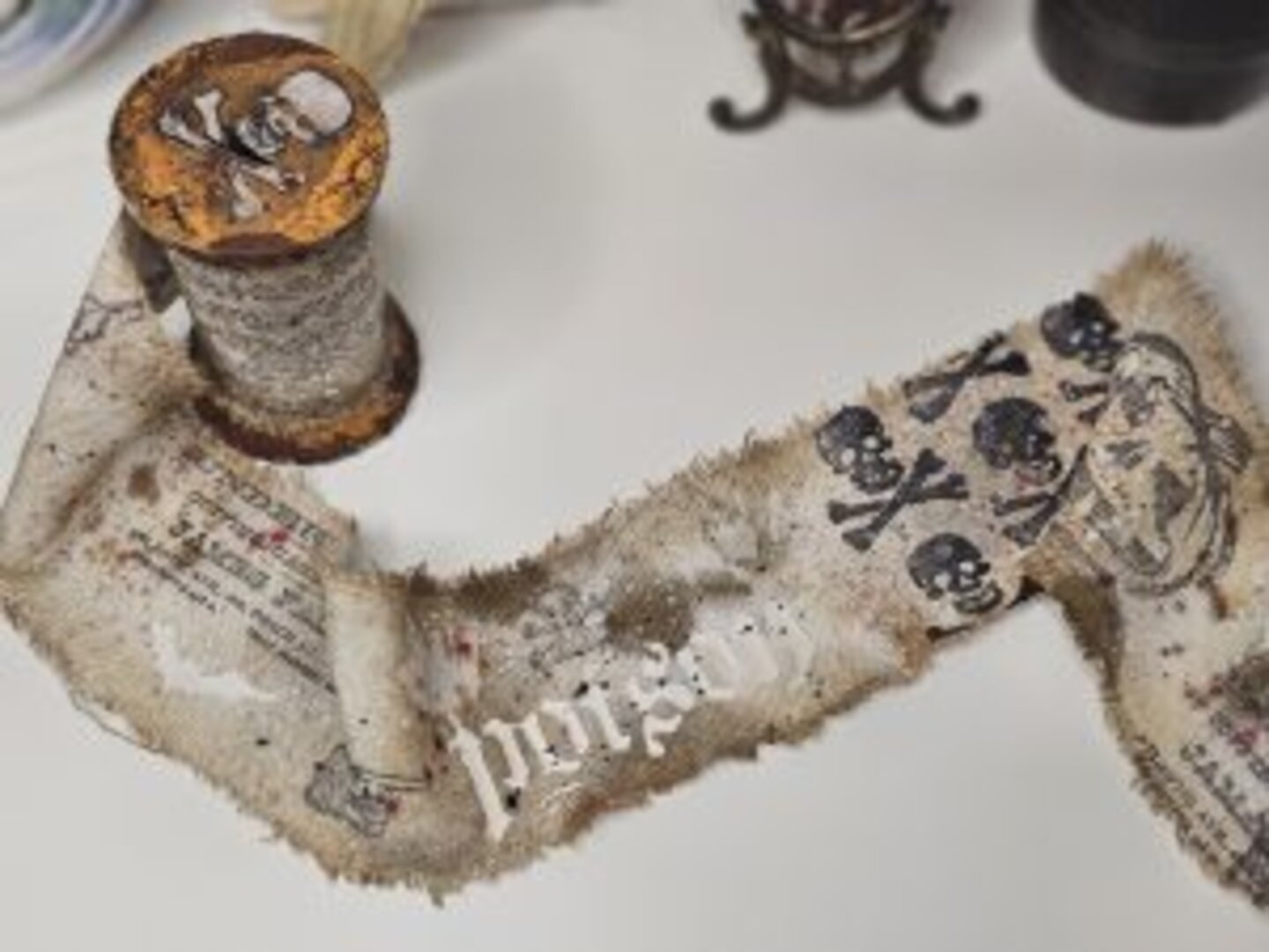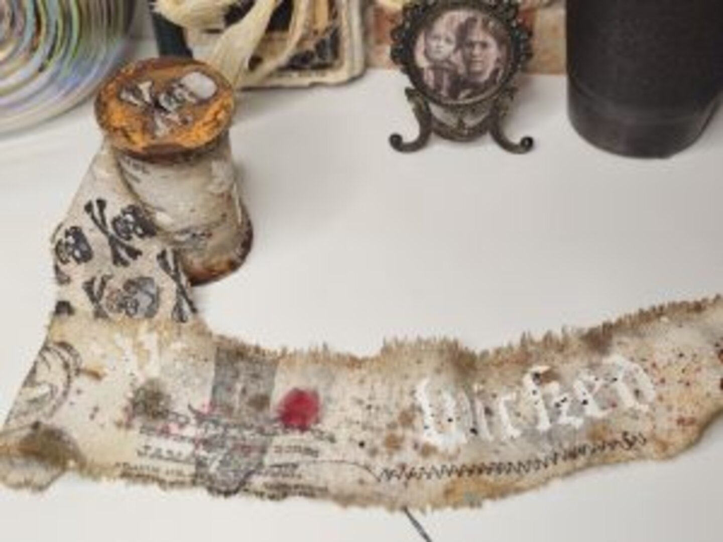 En este caso, colores muy acordes a la temática, predominan los calabaza, negros, rojos y en la bobina no, pero en el junk también los morados. En este caso la bobina también es antigua y de madera, pero quise pintarla envejecerla, darle esos toques de óxido tan bonitos que deja el paso del tiempo. Para ello usé técnicas de Mix Media.