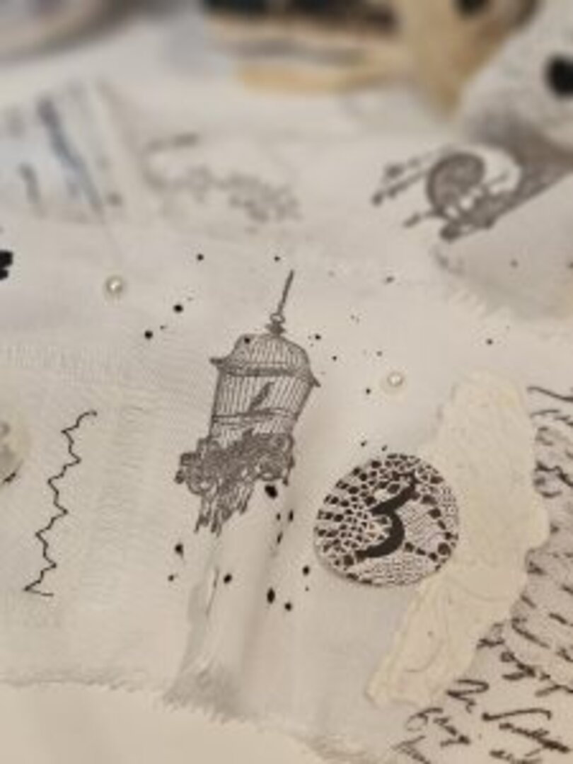 Soy la afortunada guardiana de esta bobina, y puedo decir con pleno conocimiento de causa, pues tengo el gusto de poder verla de cerca, tocarla y disfrutarla, que es una verdadera joya. Cada costura, cada puntilla, cada retal de tela, cada estampado, cada textura, cada fotografía…el entramado que conforman cada elemento visto en su conjunto y también en particular: es una delicia. Gracias por haberla creado para mí. La atesoraré siempre como orito en paño. Las bobinas de Laura son piezas, para mí, que definen su esencia dejándola volar y llegar a lo más alto. Piezas preciosas y únicas en su especie.