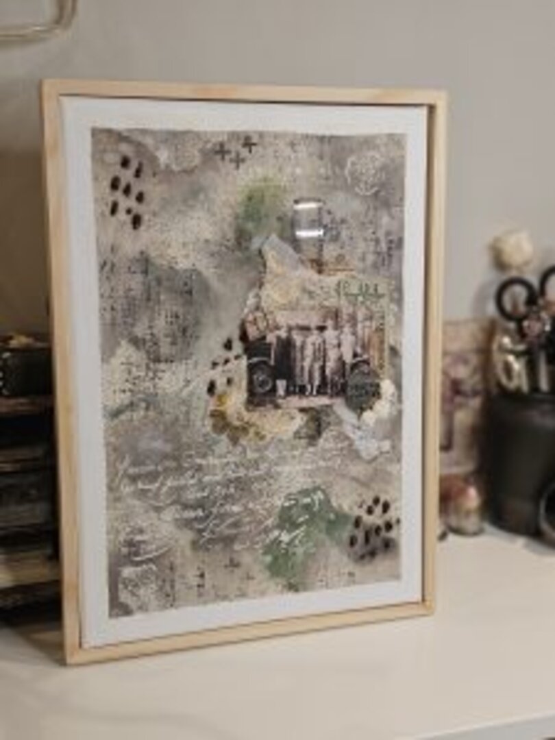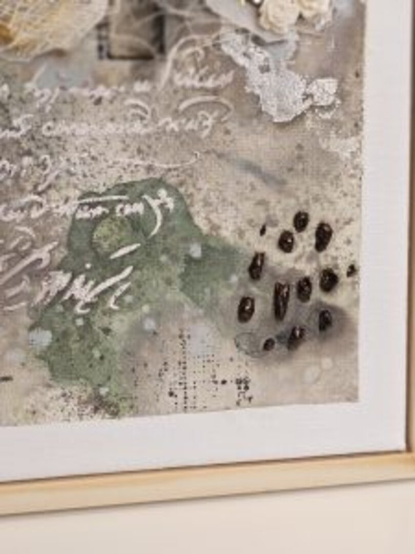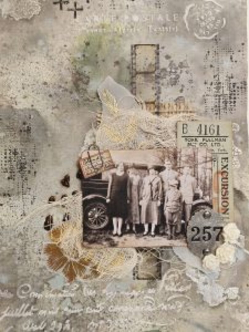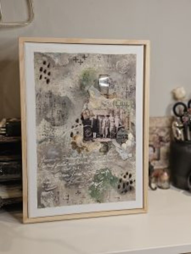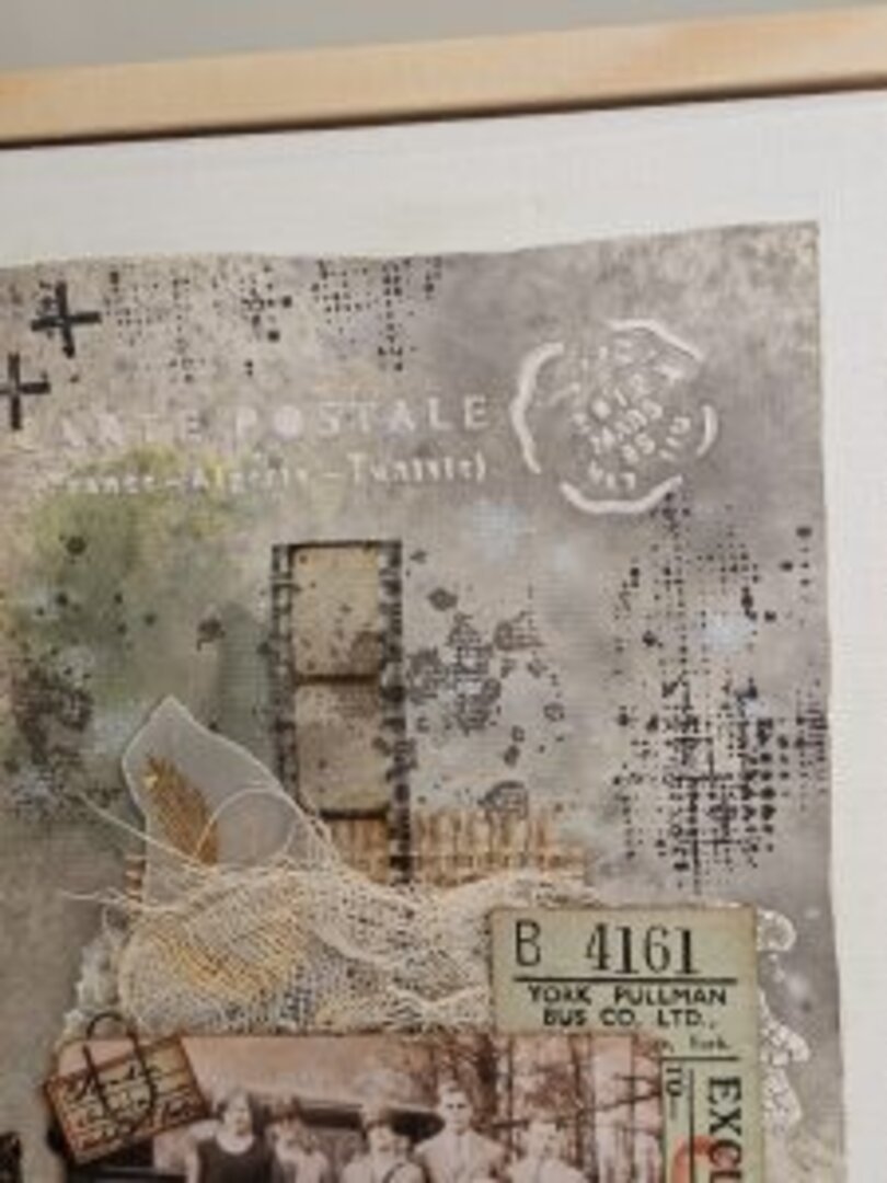 Para la deco estilo art journal, he usado diferentes elementos de Tim H., tickets antiguos reales, flores de resina, gasa médica teñida con café…