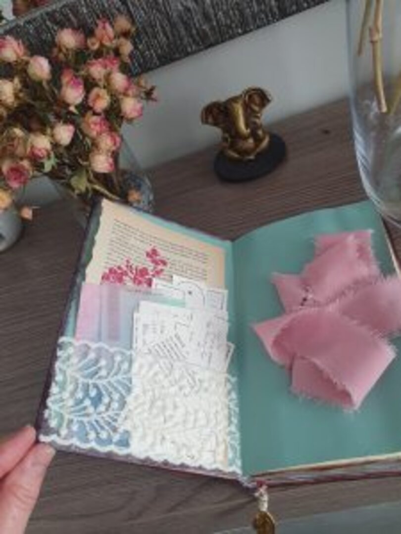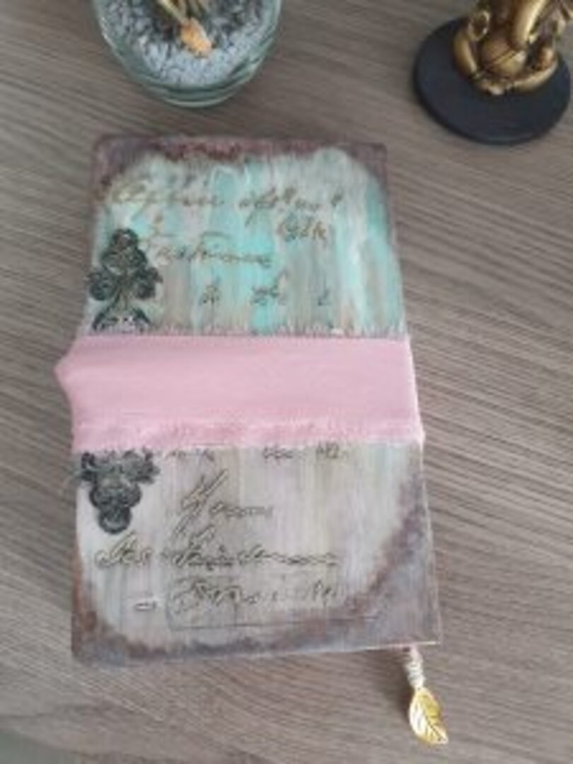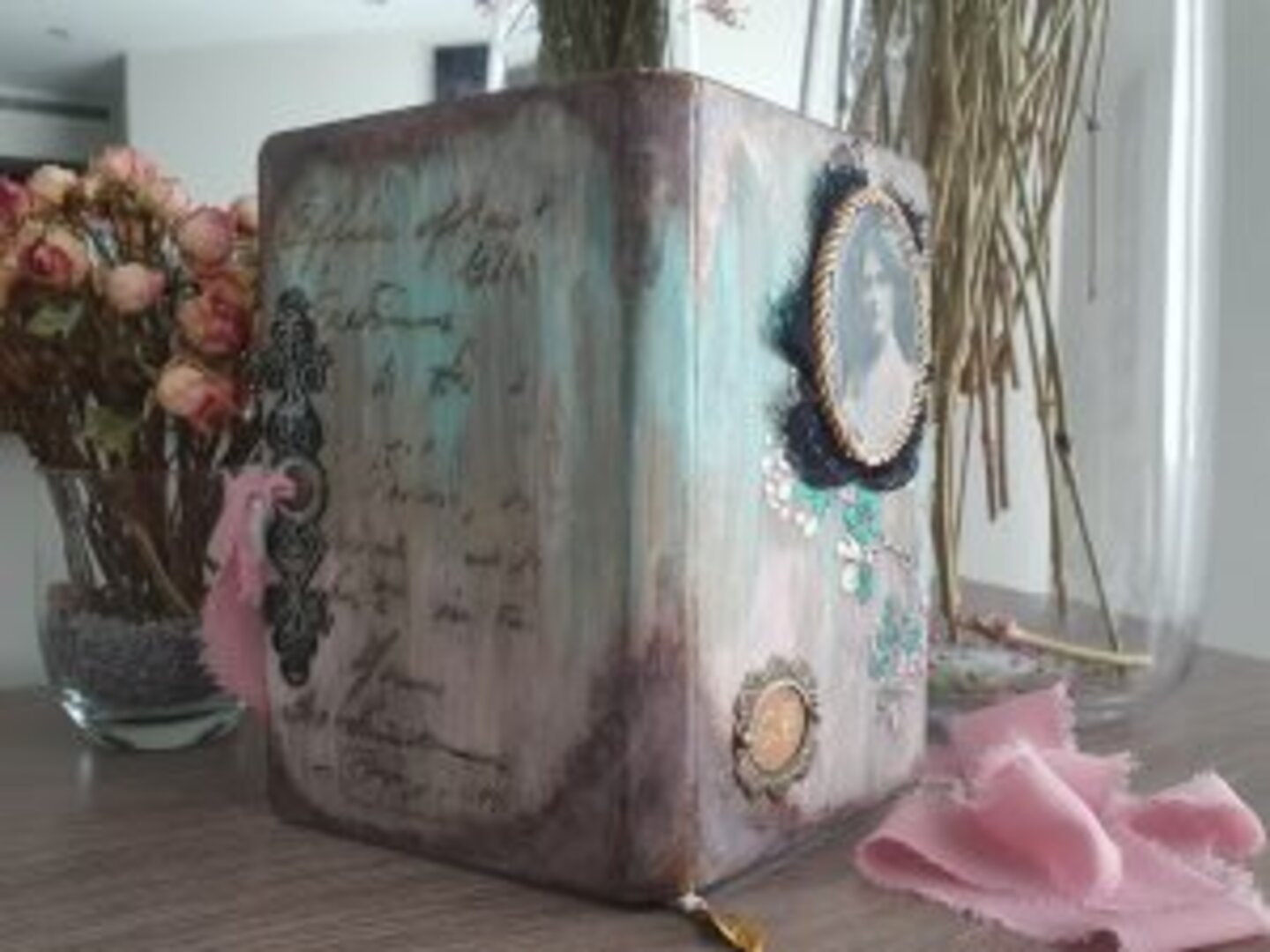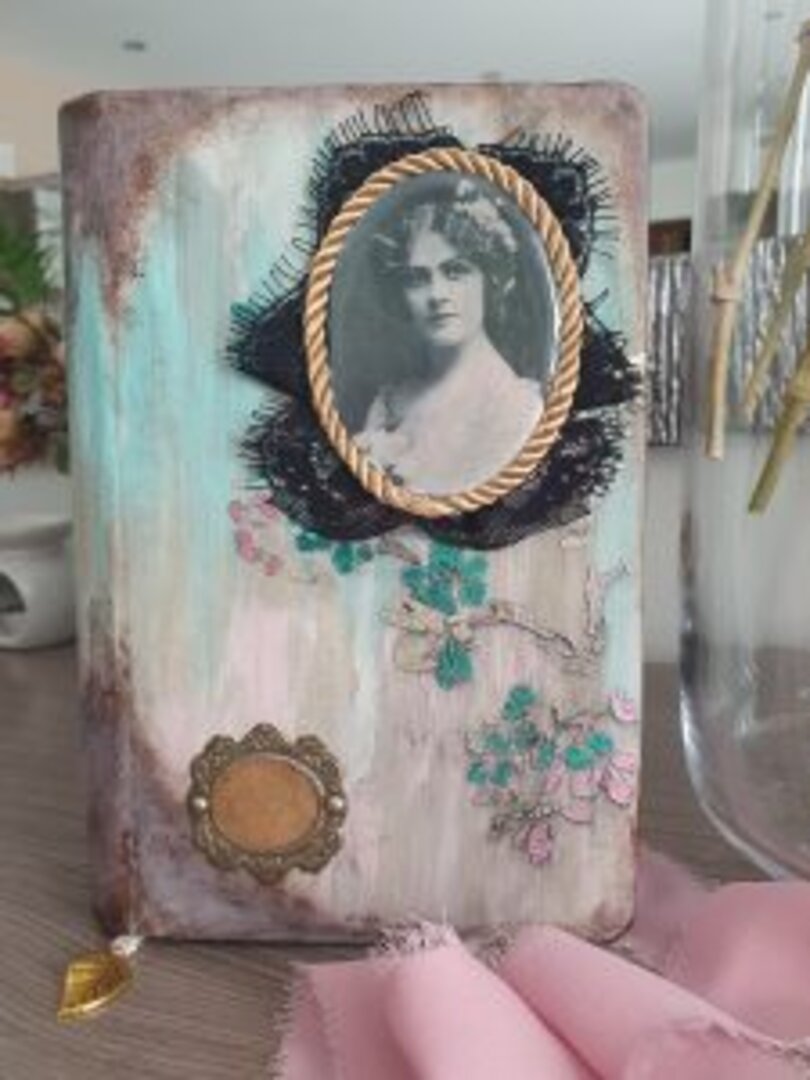 Usamos diferentes técnicas y productos, antiquin powder, antiquin paint, pasta de textura, ceras, encaje, cordón de seda, foto antigua y simulamos un cristal para proteger y dar ese toque vintage.