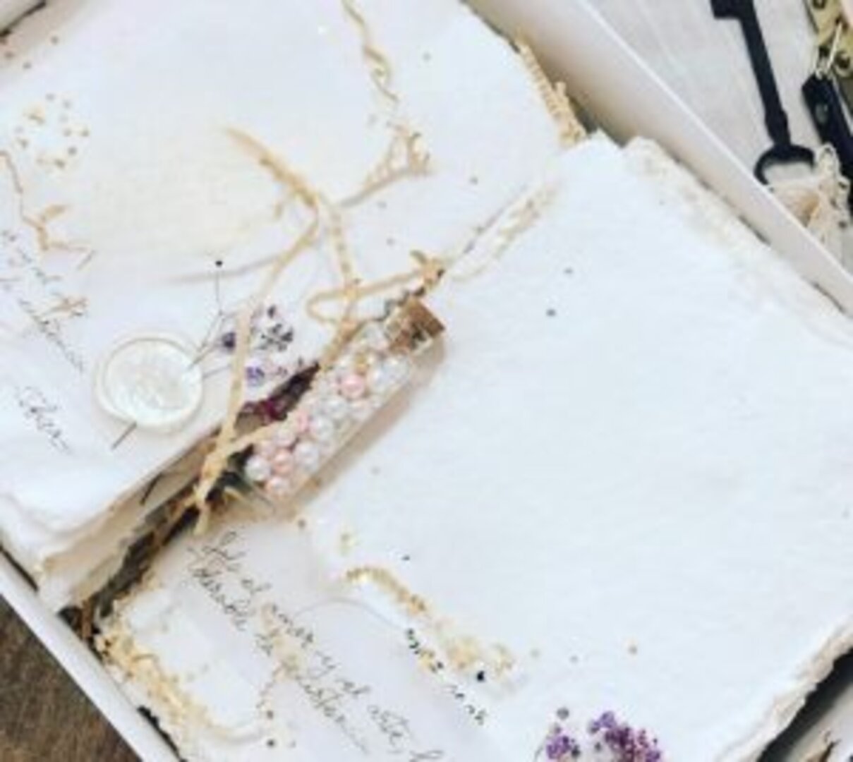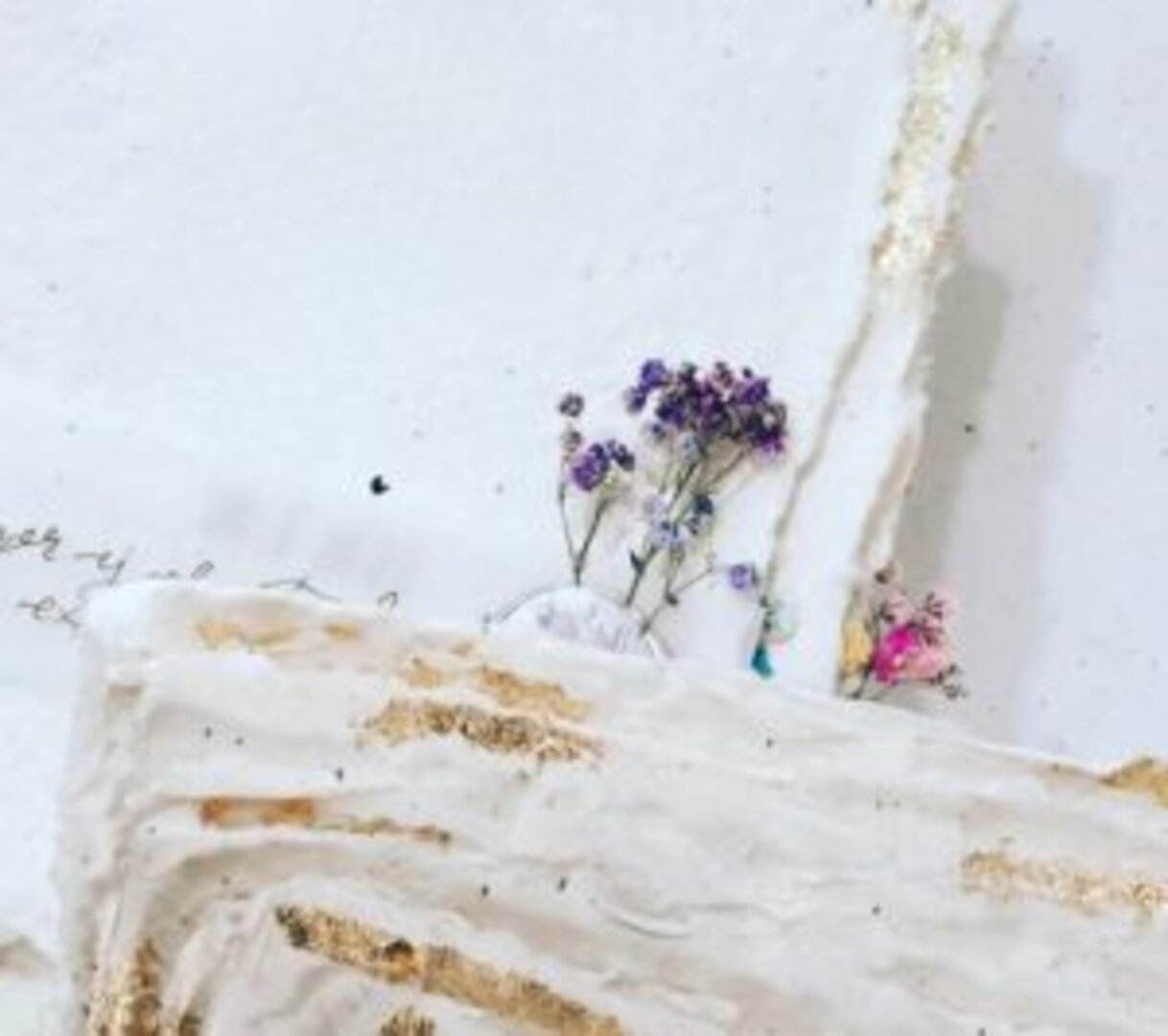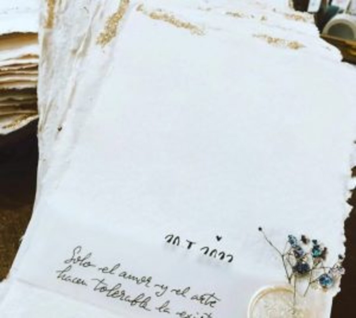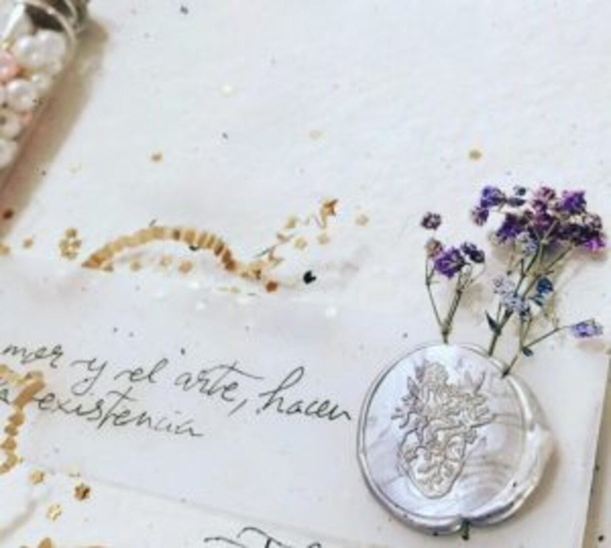 Papel de algodón, pan de oro, lacres y paniculata prensada, junto con un fajín en velum y una preciosa letra, hicieron de esta invitaciones, algo muy especial, no solo para los novios, también para el día de trabajo y ambientazo que tuvimos ese día.