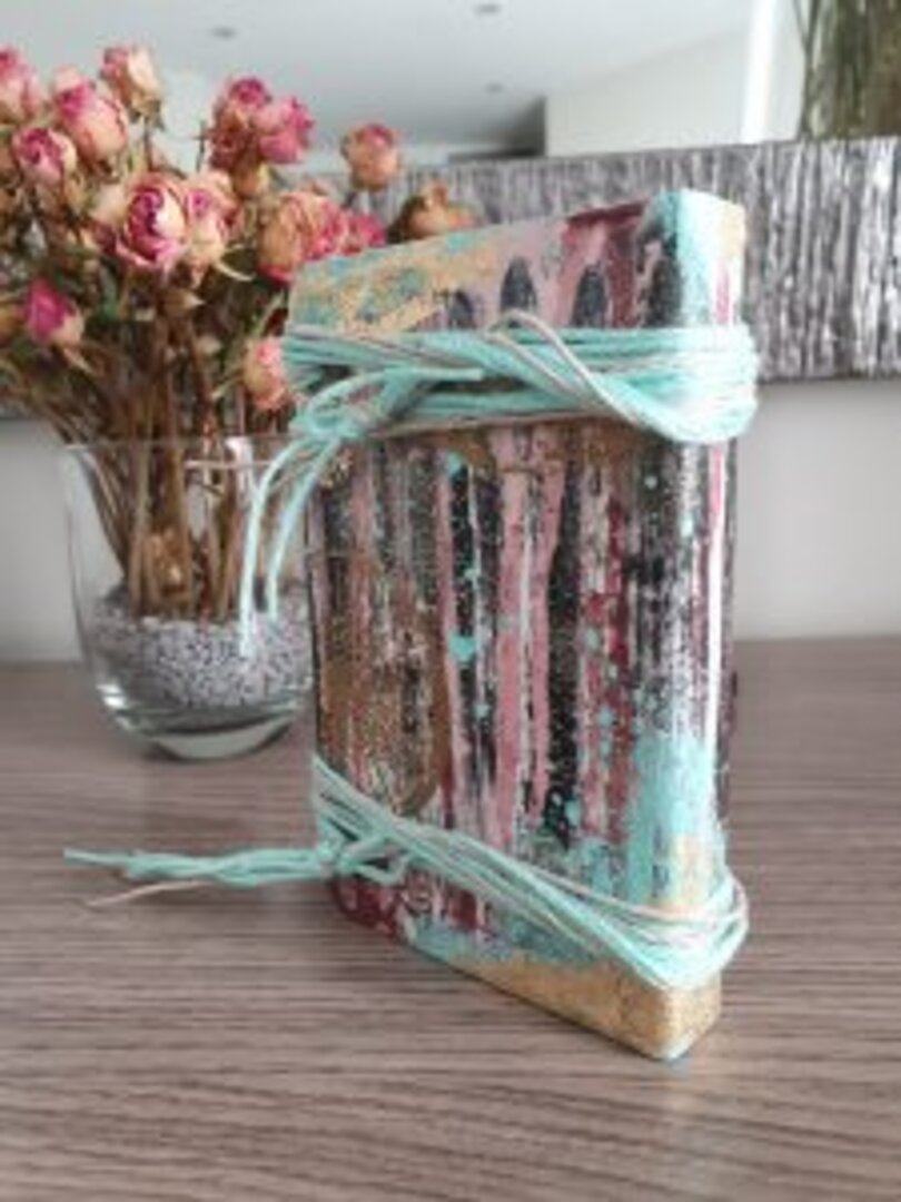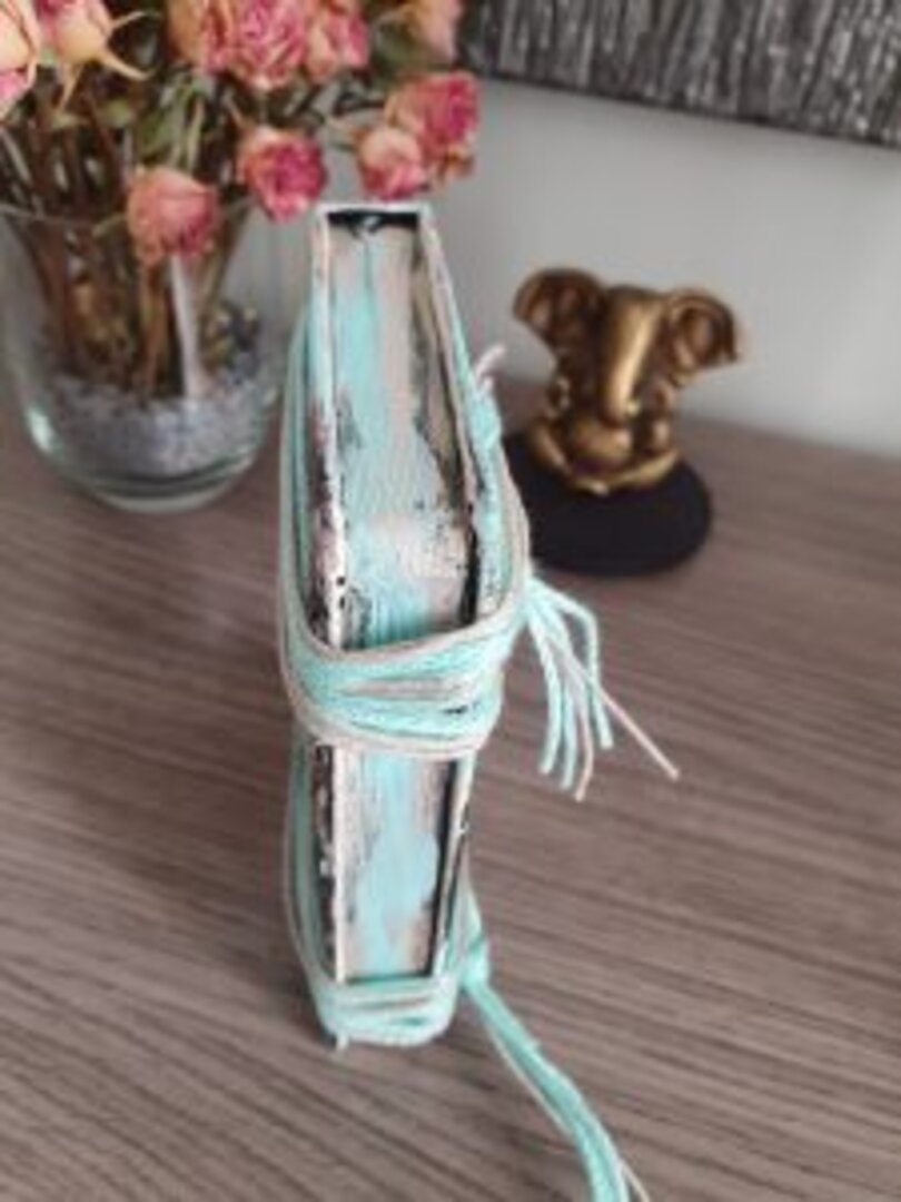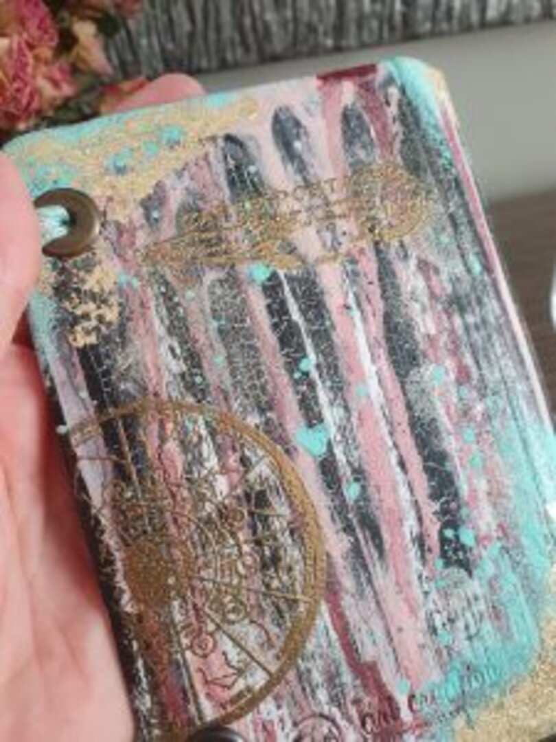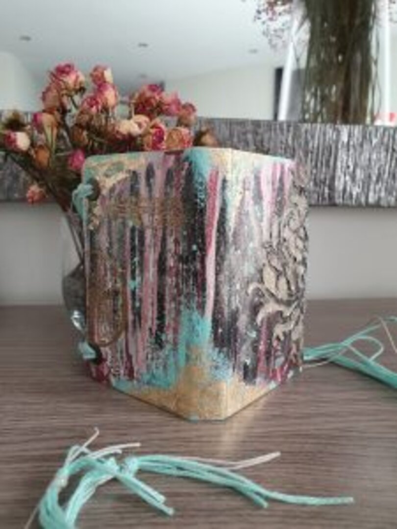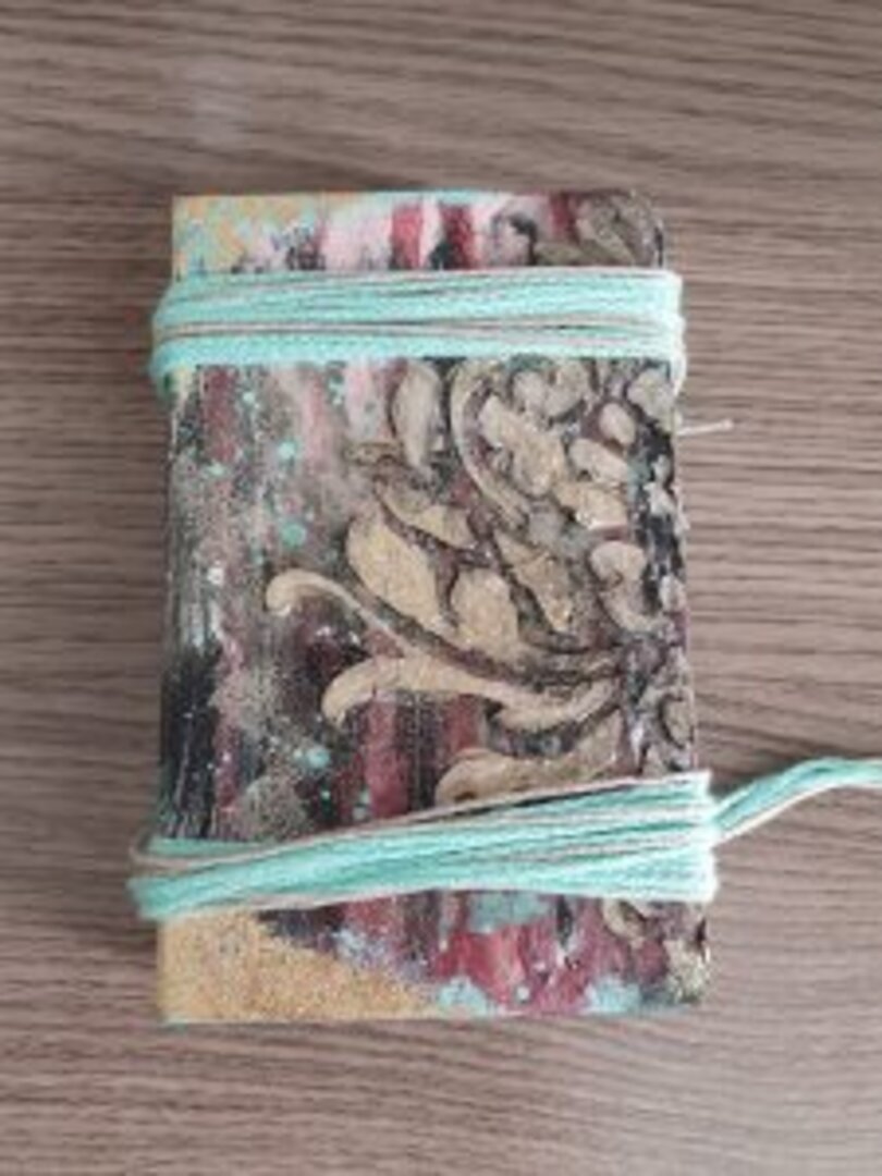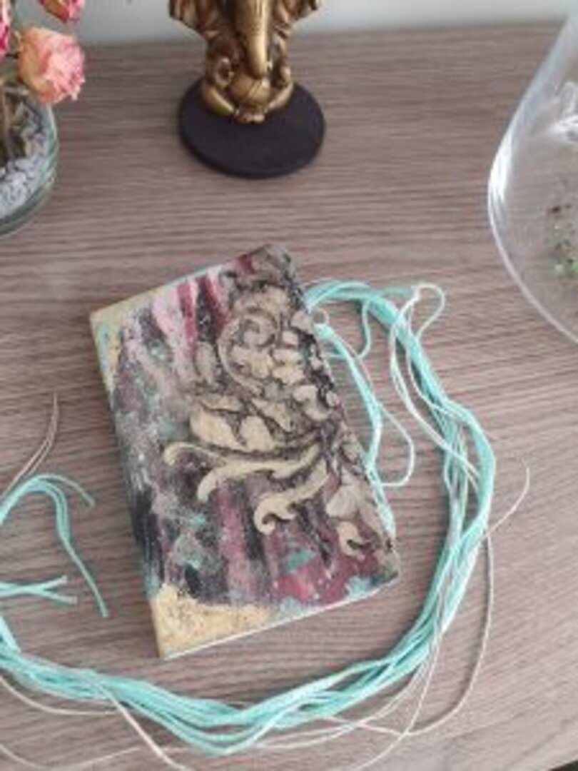 Usé diferentes acrílicas, y ceras, pastas de textura y jugué con aguadas. Para los cierres lana en 2 tonos.