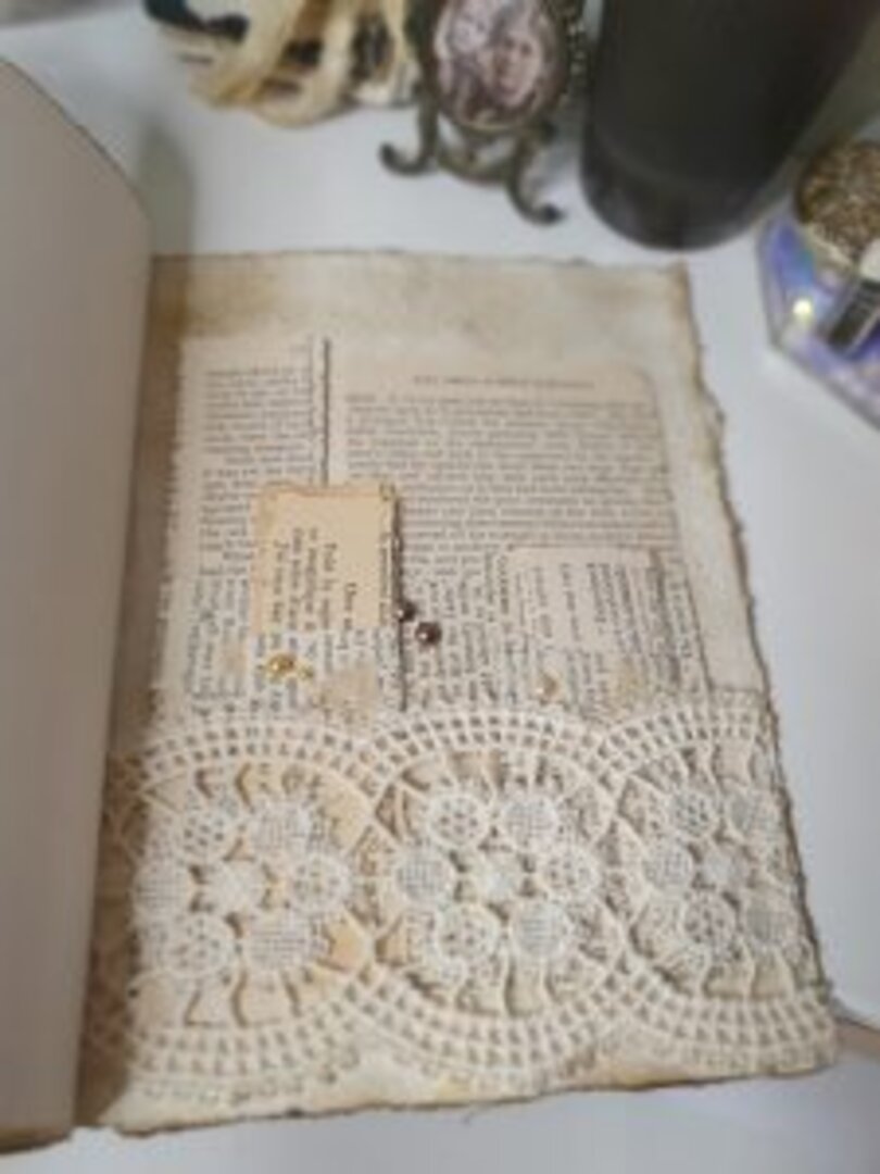 Además, 2 mini muestrarios de puntillas y un kit de trozos de papel antiguo para hacer creaciones. La pinza? antigua con hilo color crudo.