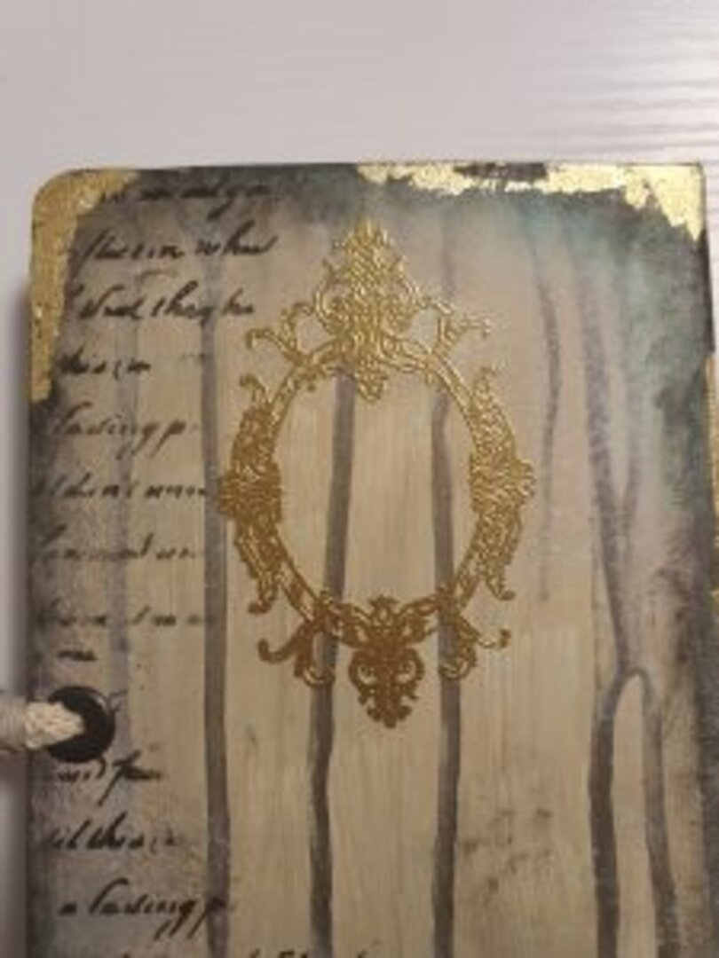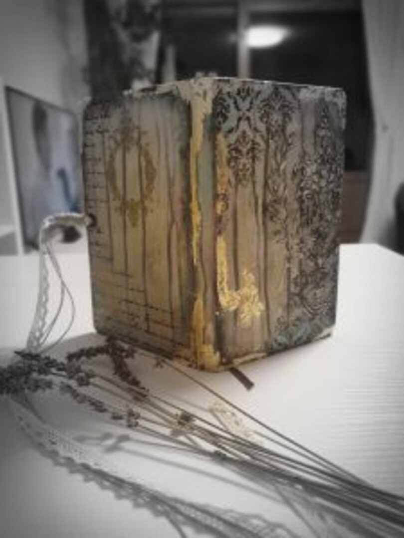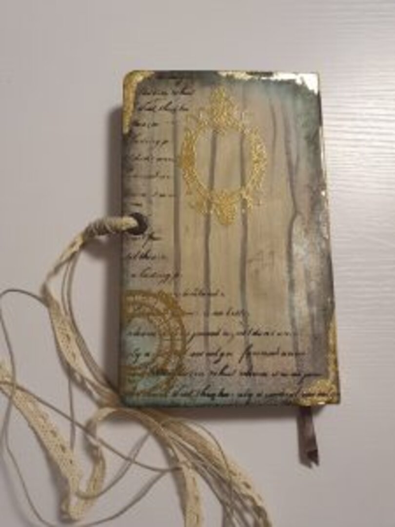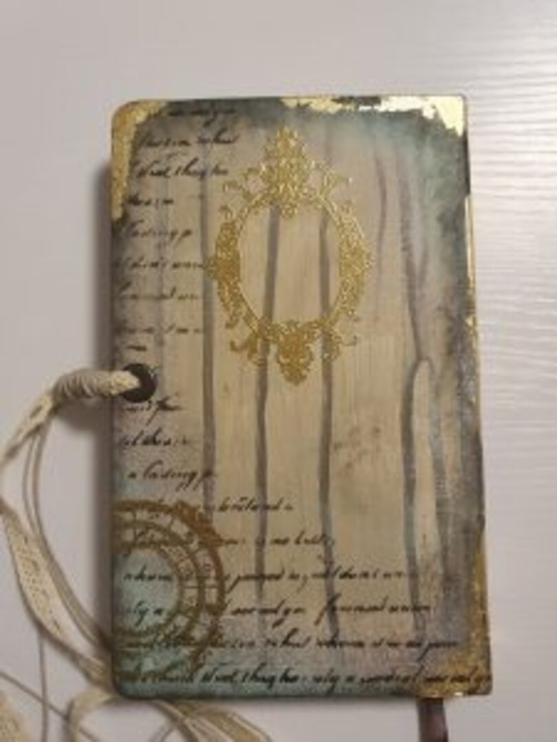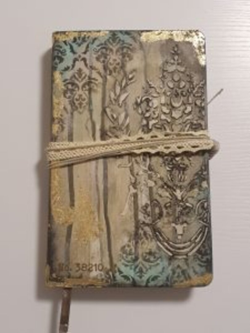 Y de las que más me gustan, sino la que más… siempre uso libretas tipo Moleskine, tiene muchísimas técnicas aplicadas y mucho material, acrílico, antiquin powder, texturas, ceras, embossing, foil, ceranticas… y qué me dices de las tonalidades? lino, dorado, negro, verde….