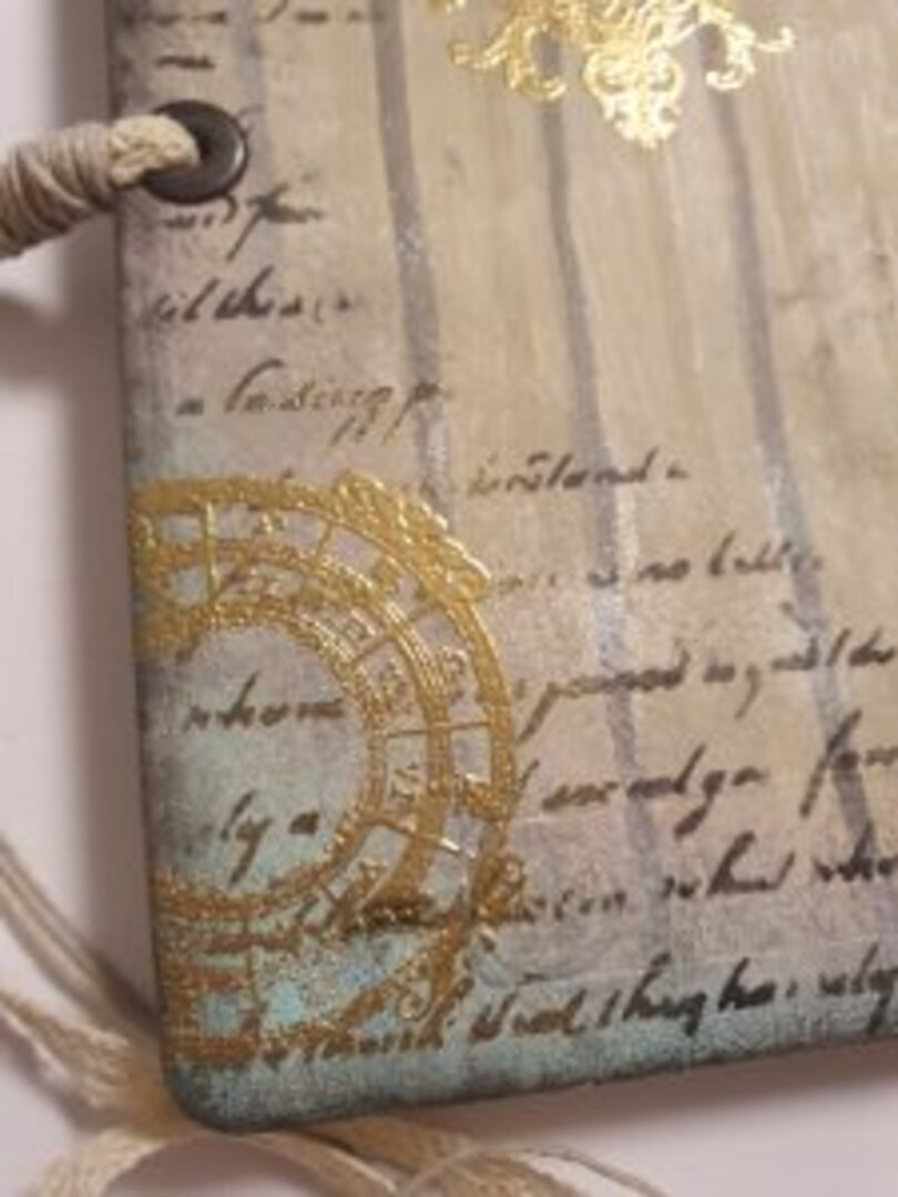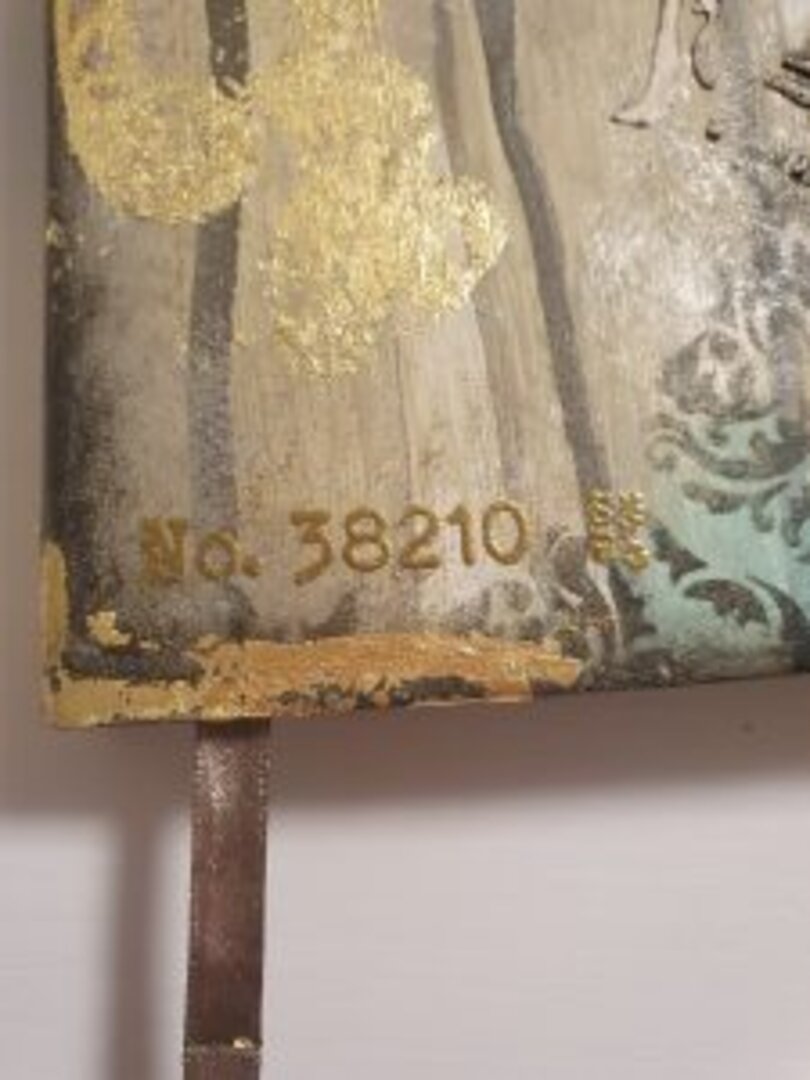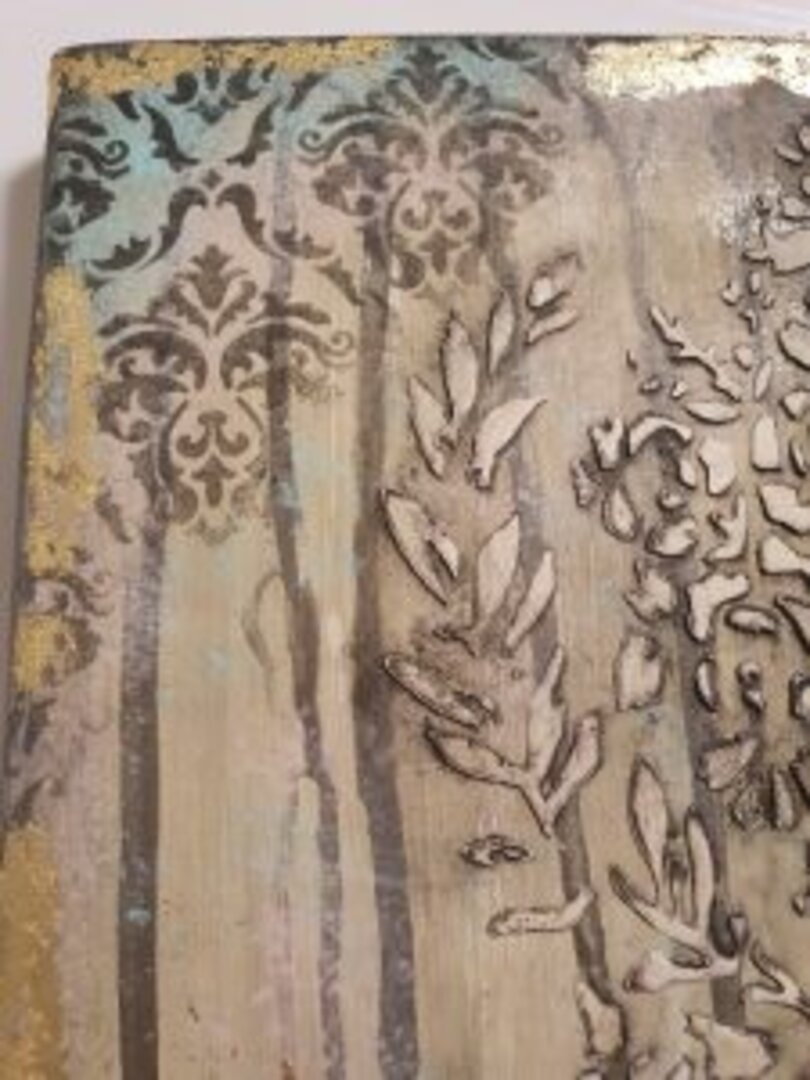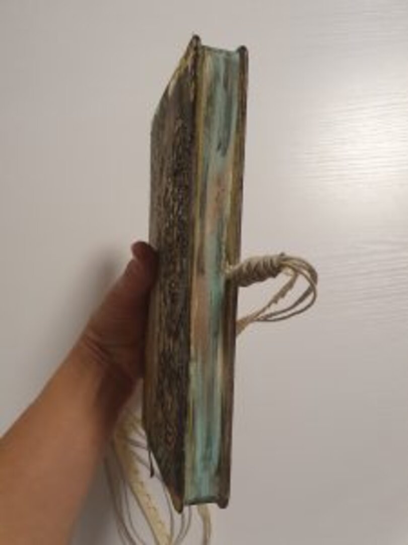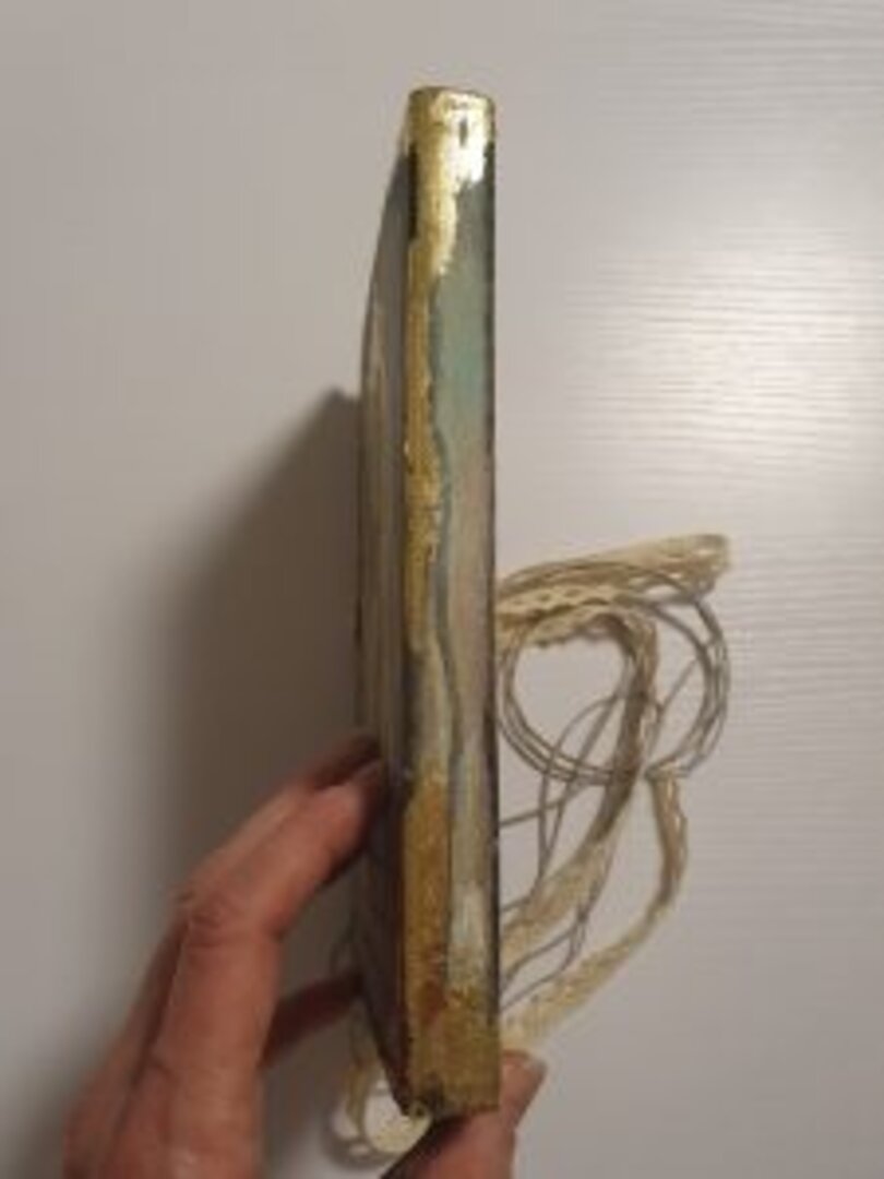 Y de las que más me gustan, sino la que más… siempre uso libretas tipo Moleskine, tiene muchísimas técnicas aplicadas y mucho material, acrílico, antiquin powder, texturas, ceras, embossing, foil, ceranticas… y qué me dices de las tonalidades? lino, dorado, negro, verde….