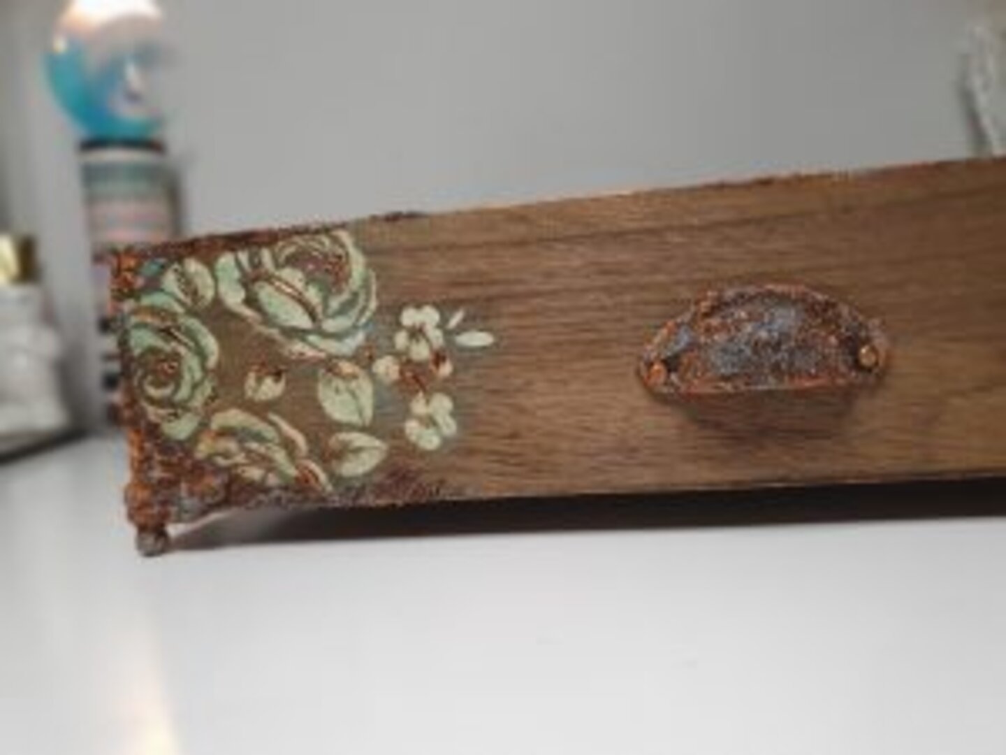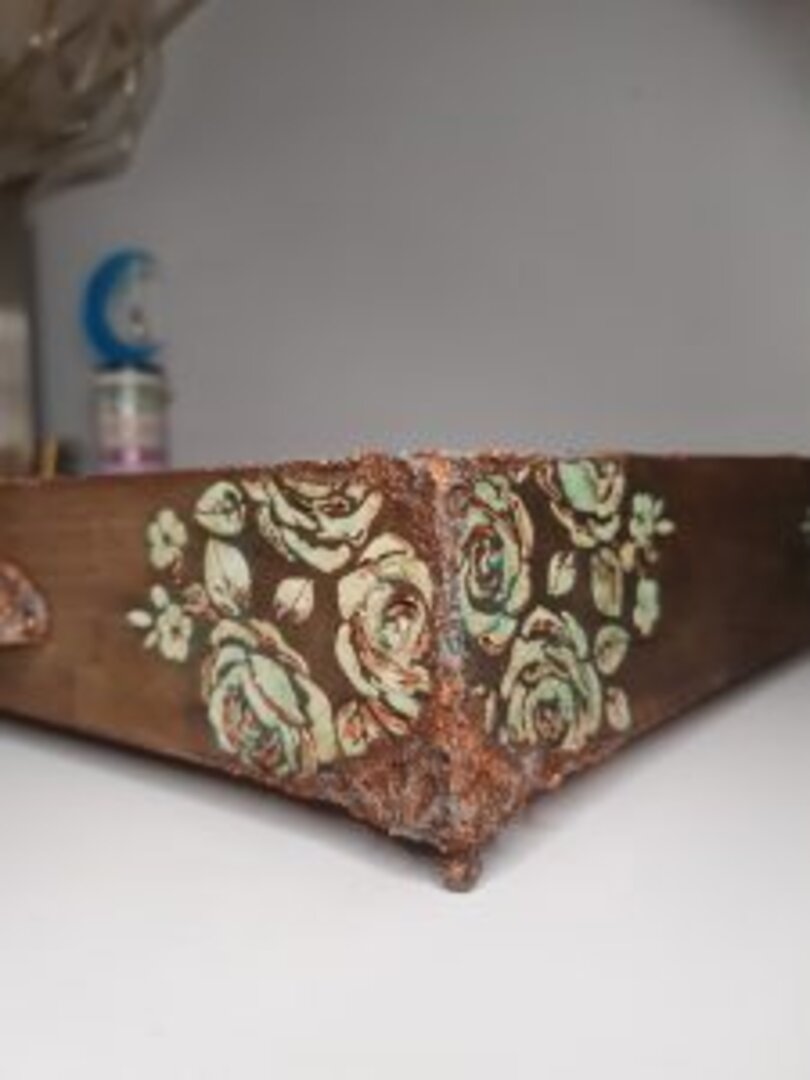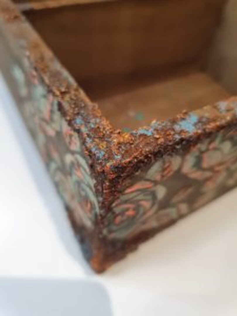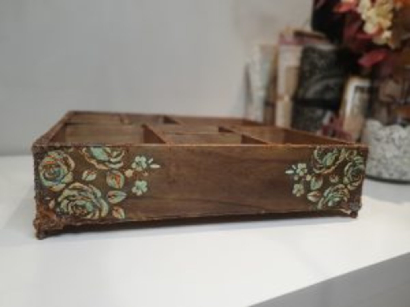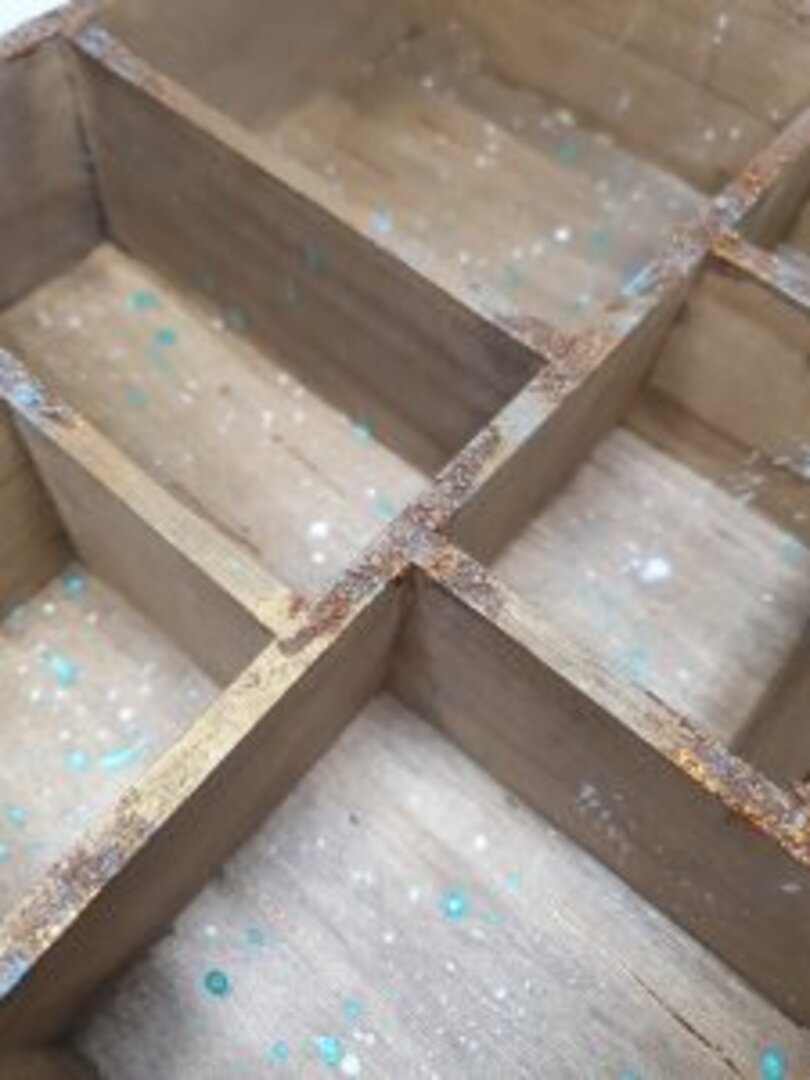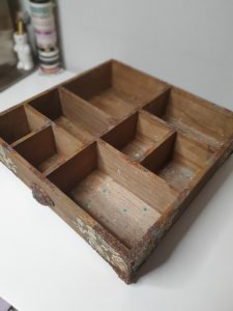Caja en madera natural con diferentes departamentos. Lo primero que quise es darle aspecto a paso del tiempo, así que la envejecí con unos tonos más oscuros. Como era un encargo de mi querida amiga Aida, quise que fuera sencillo, atemporal… que pudiera usarlo en cualquier rincón y con cualquier decoración de su casita.
