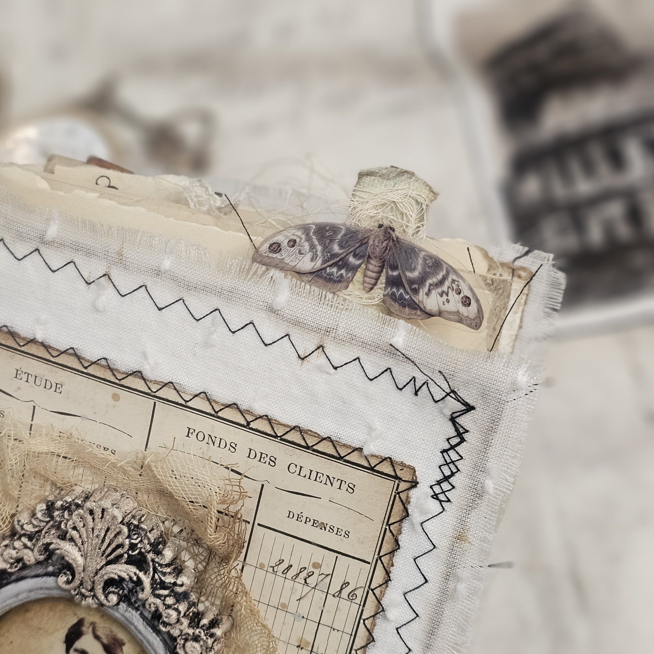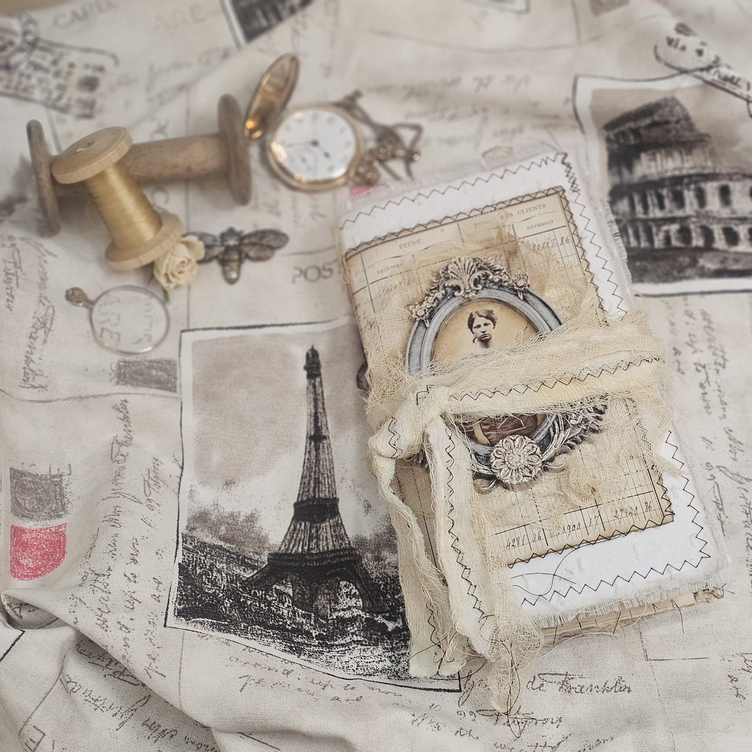 Trabajazo montando los kits de materiales. Todo lo que usamos es material antiguo, hacer los moldes de resina para la portada, elegir las fotos, las telas, las puntillas… y grabar!!! todo un reto!